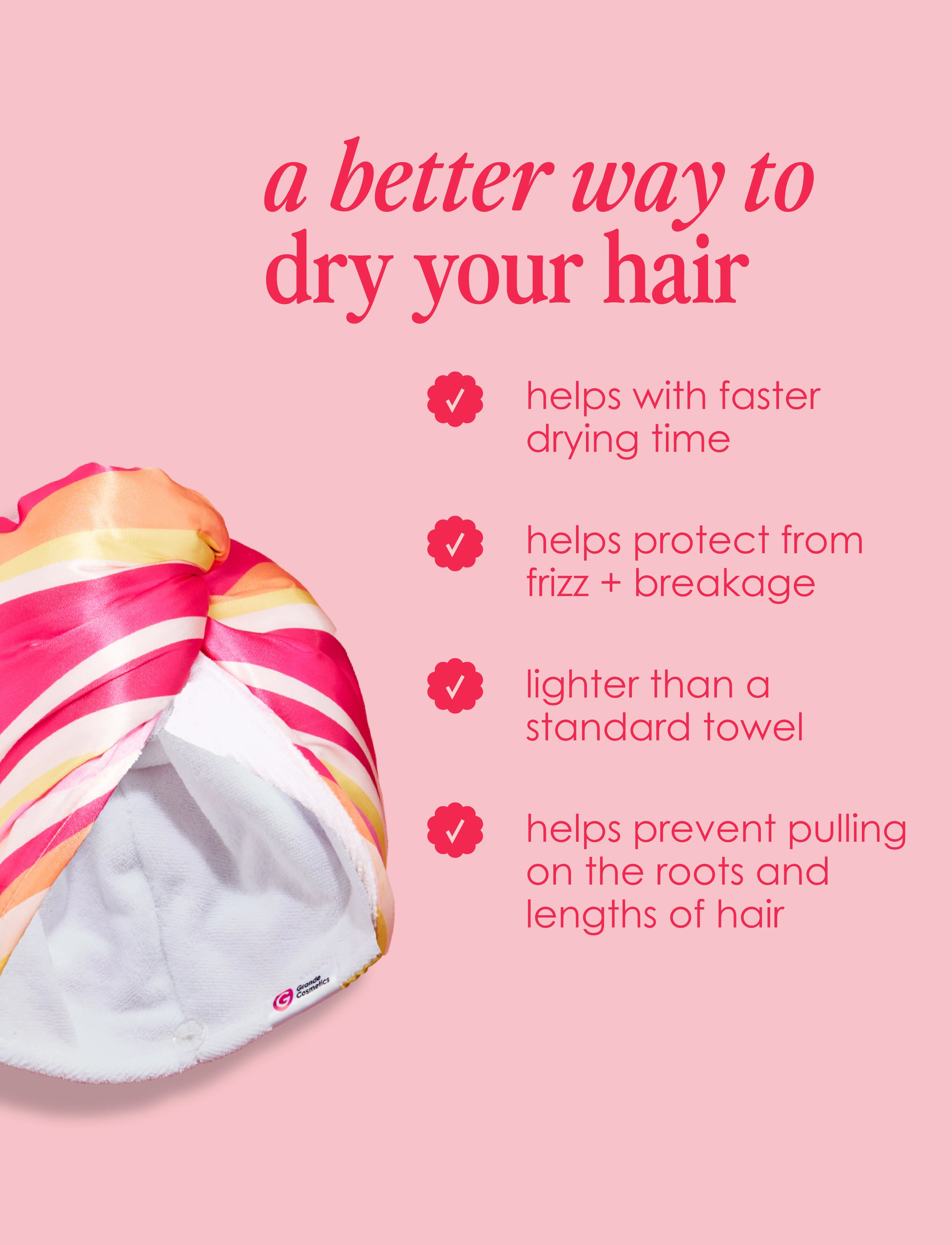 Twist it. Dry it. Rock it. Combining two different materials - microfiber on one side, and satin on the other. The microfiber side is made for freshly washed hair, aids in drying, and reducing frizz & breakage. The satin side is great for sleeping & helps prevent split ends, breakage, tangles and thinning hair.